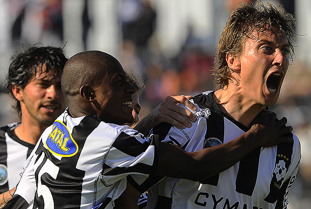 Matías Quagliotti se llena la boca de gol en el festejo del primer tanto bohemio que comparte con Leandro Paiva.