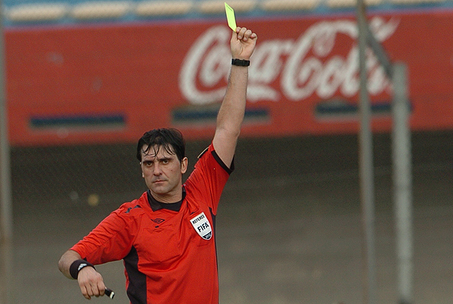 Darío Ubriaco con la tarjeta amarilla en alto. Amonestó a cinco jugadores de Nacional.