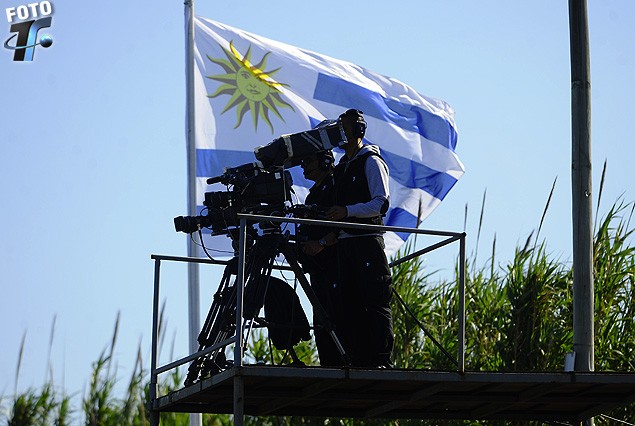 La bandera uruguaya ondea esplendorosa por detrás del camarógrafo que sumamente concentrado capta las imágenes del encuentro subido a un andamio.